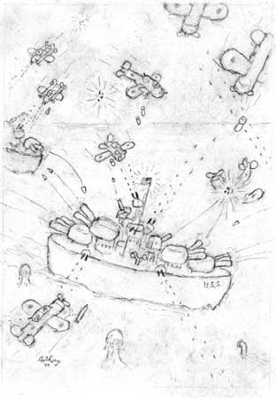 WILLIAM ANTHONY ![]() Track 16 Gallery and Smart Art Press are pleased to announce a new exhibition featuring the charmingly satirical drawings of William Anthony, excerpted from his new book War Is Swell. The exhibition will run from February 19 to April 15, 2000, with an opening reception on February 19th. From the beginning of World War II, when William Anthony was seven years old, to its end, when he was almost eleven, he was a real American patriot. Lucky enough to be spared the tragedy of the war, he and his boyhood friends savored its adventure through the letters, the newspapers, and the comic books that reached his quiet Tacoma, Washington, suburb. They kept dutifully abreast of wartime strategy and watched the skies faithfully for enemy attack, longing for the chance to contribute to the war effort. We loved the fighting men and the combat, Anthony writes in the introduction to the exhibition catalogue, We loved weapons and the mayhem they caused. We loved the air raids, the commando raids and the plots to kill Hitler. War Is Swell is a narrative reenactment of this elaborate and innocent experience of war in Anthony's raw signature style unfiltered, uncensored, and untempered by political correctness. Its cast of characters includes Hitler ( a paper-hanger who got this job as dictator of Germany), Admiral Yamamoto (who liked to put tacks on the chairs used by the other officers to keep them alert ), General Patton, blonde lady spies who liked to get secrets in return for certain favors, and scores of soldiers, civilians, tanks, and planes from all sides. Both a lyrical testament to childhood enthusiasm and a harrowing glimpse into the mechanics of propaganda and ignorance, War Is Swell is a wry and provocative contribution to the annals of American history. Smart Art Press Catalogue |