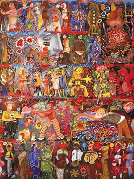 The paintings of London-born artist David Forbes take the viewer through the shadowed corners of a circus gone haywire. His Bosch-like compositions teem with surreal creatures in carnivalesque costumes, toys, demons, and genitalia, all in bright, heavily saturated colors amid hallucinogenic landscapes. They chart obscure regions of the psyche and spin color and symbol into a hellish sort of rapture. According to the artist, "Stations of the Cross" (one of the two series in the exhibition) was made "to alleviate incipient madness associated with unruly brain-visitors, hallucinations, and spells of absence." Like massive spider webs, the canvases have captured the freakier, wayward bits of a frenzied imagination and leave them suspended in space to torture one another. |